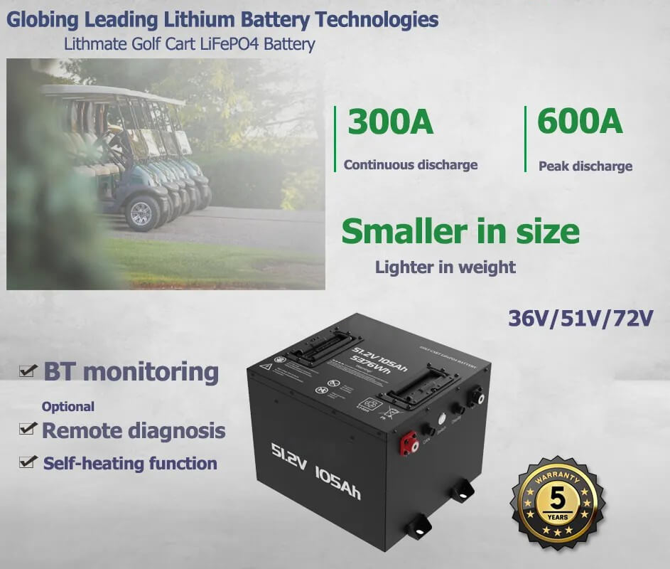 【Ngalih saka Lead-Acid Today】 Baterei kréta golf lithium nyedhiyakake kinerja sing kuat, cocog kanggo medan sing angel lan nambah game golf sampeyan, kanthi ngatur nganti 50 mil saben pangisian daya, ngilangi rasa kuwatir.