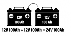 Ing gambar ing ngisor iki, ana loro Baterei 12V disambungake ing seri sing dadi sistem baterei iki dadi sistem 24V. Sampeyan uga bisa ndeleng manawa bank isih duwe rating kapasitas total 100 Ah.